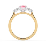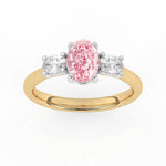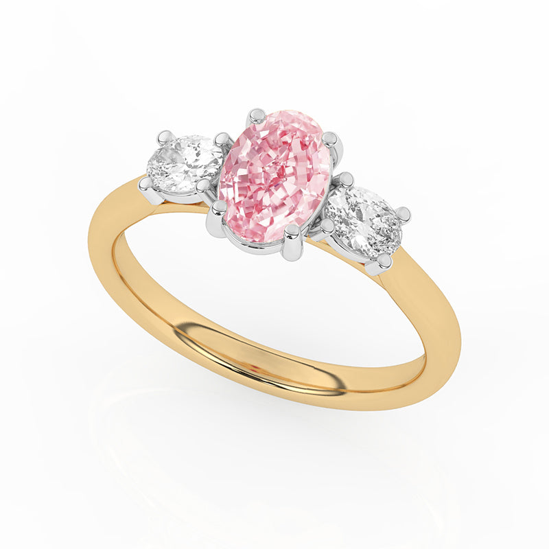 Description: Diamond Three Stone Ring, Set with Oval Cut Lab Pink Diamond & Two Oval Cut Lab Diamonds, Set in 9ct or 18ct Yellow Gold (Verifiably IGI Report Included)