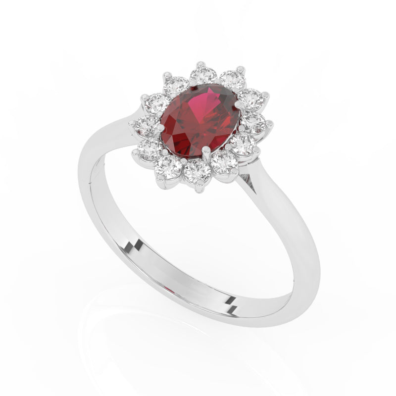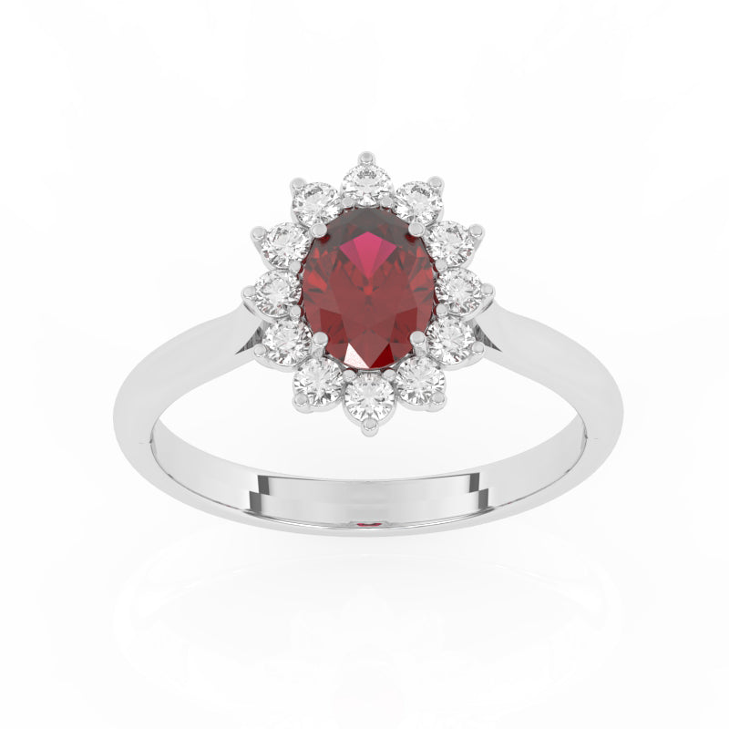 Description: Diamond & Ruby Cluster Ring, Set with Oval Cut Lab Ruby & Twelve Brilliant Cut Lab Diamonds, Set in 9ct or 18ct White Gold or Platinum