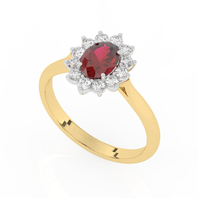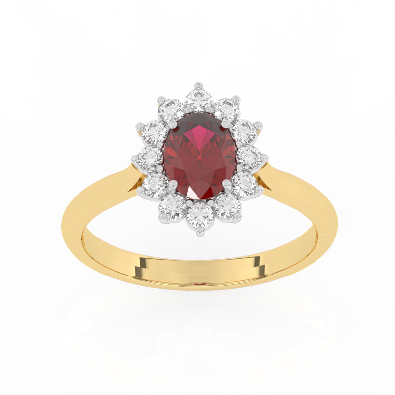 Description: Diamond & Ruby Cluster Ring, Set with Oval Cut Lab Ruby & Twelve Brilliant Cut Lab Diamonds, Set in 9ct or 18ct Yellow Gold
