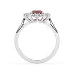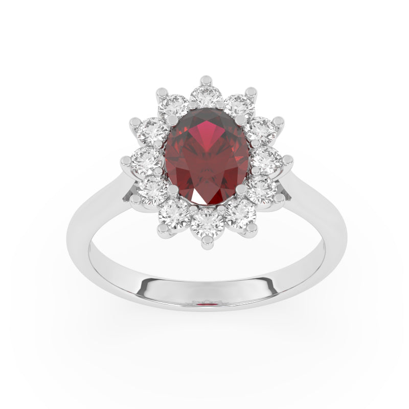 Description: Diamond & Ruby Cluster Ring, Set with Oval Cut Lab Ruby & Twelve Brilliant Cut Lab Diamonds, Set in 9ct or 18ct White Gold or Platinum