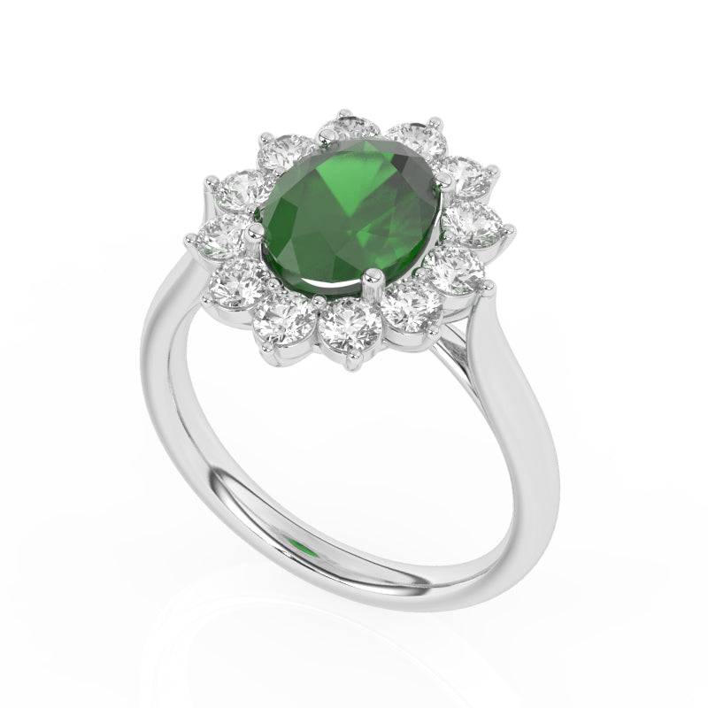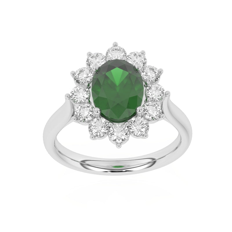 Description: Diamond & Emerald Cluster Ring, Set with Oval Cut Lab Emerald & Twelve Brilliant Cut Lab Diamonds, Set in 9ct or 18ct White Gold or Platinum