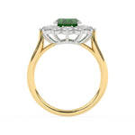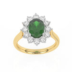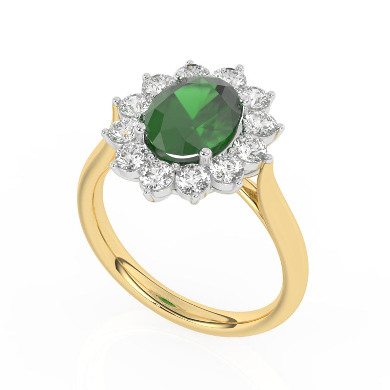 Description: Diamond & Emerald Cluster Ring, Set with Oval Cut Lab Emerald & Twelve Brilliant Cut Lab Diamonds, Set in 9ct or 18ct Yellow Gold