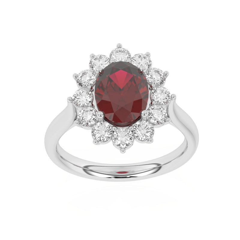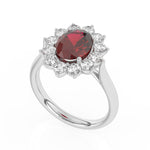 Description: Diamond & Ruby Cluster Ring, Set with Oval Cut Lab Ruby & Twelve Brilliant Cut Lab Diamonds, Set in 9ct or 18ct White Gold or Platinum