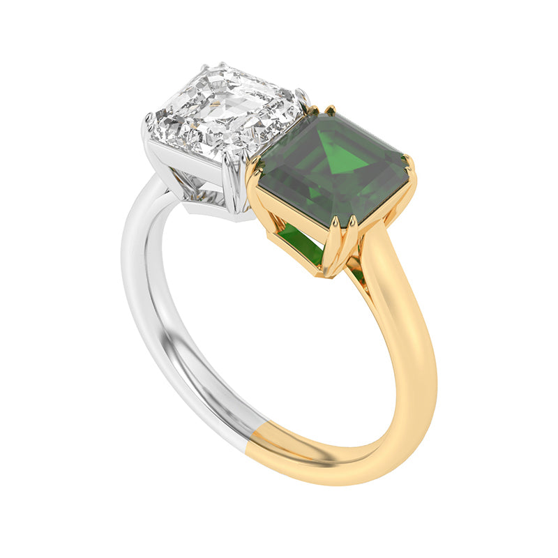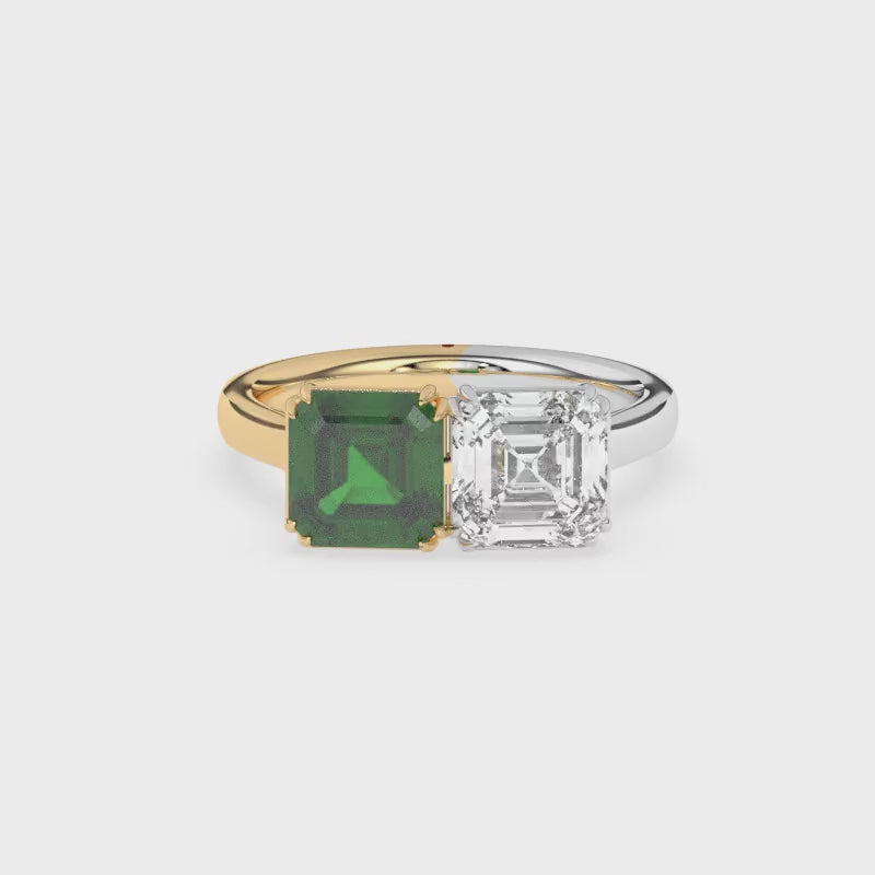 Description: Diamond & Emerald Two Stone Ring, Set with One Cushion Cut Lab Emerald & One Cushion Cut Lab Diamond, Set in 9ct or 18ct Yellow/White Gold