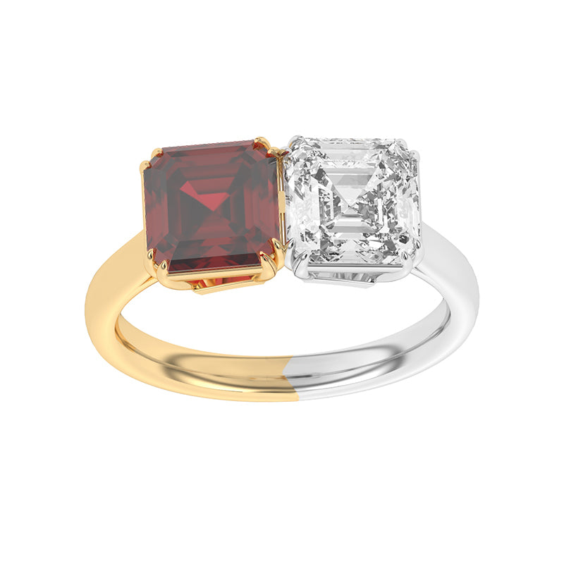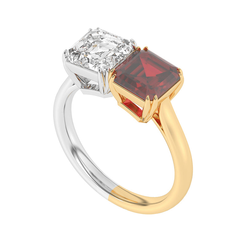Description: Diamond & Ruby Two Stone Ring, Set with One Cushion Cut Lab Ruby & One Cushion Cut Lab Diamond, Set in 9ct or 18ct Yellow/White Gold