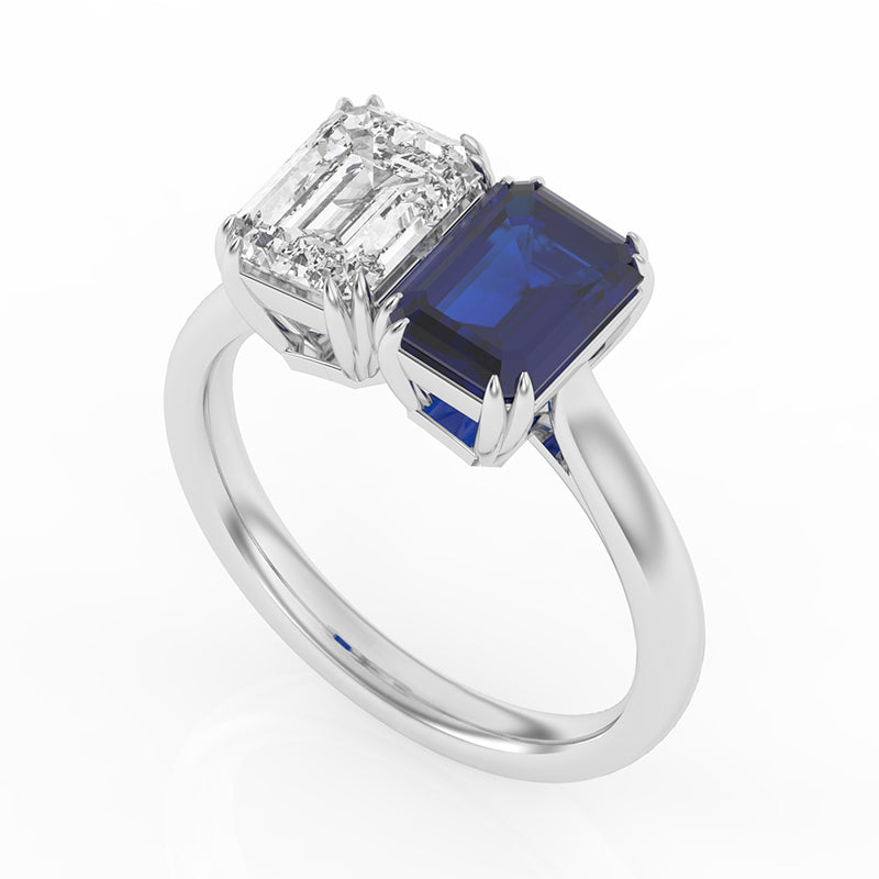 Description: Diamond & Sapphire Two Stone Ring, Set with One Emerald Cut Lab Sapphire & One Emerald Cut Lab Diamond, Set in 9ct or 18ct White Gold or Platinum