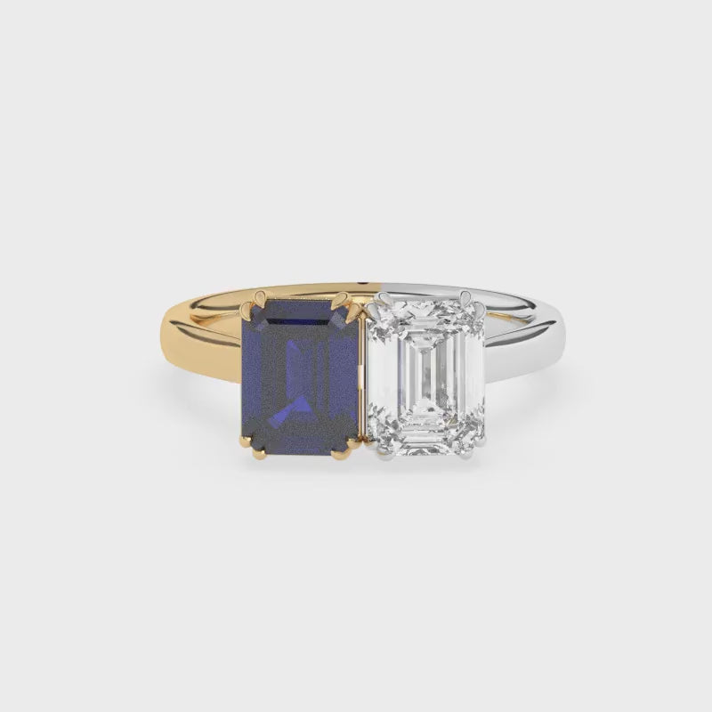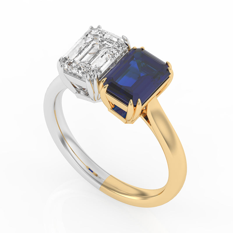 Description: Diamond & Sapphire Two Stone Ring, Set with One Emerald Cut Lab Sapphire & One Emerald Cut Lab Diamond, Set in 9ct or 18ct Yellow Gold