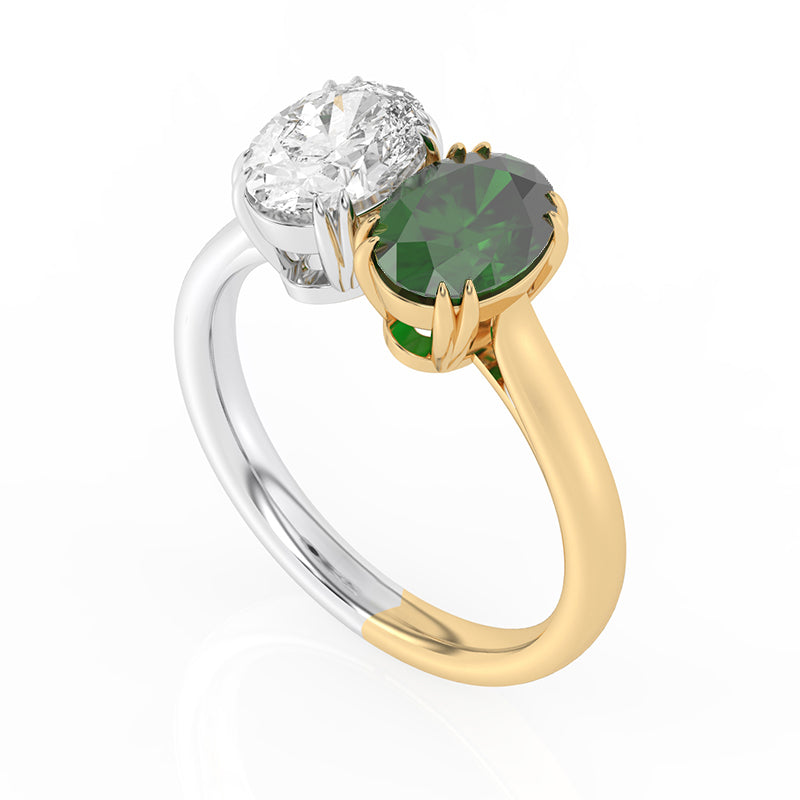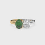 Description: Diamond & Emerald Two Stone Ring, Set with One Oval Cut Lab Emerald & One Oval Cut Lab Diamond, Set in 9ct or 18ct Yellow Gold