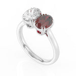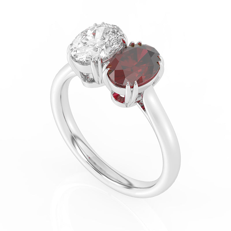 Description: Diamond & Ruby Two Stone Ring, Set with One Oval Cut Lab Ruby & One Oval Cut Lab Diamond, Set in 9ct or 18ct White Gold or Platinum