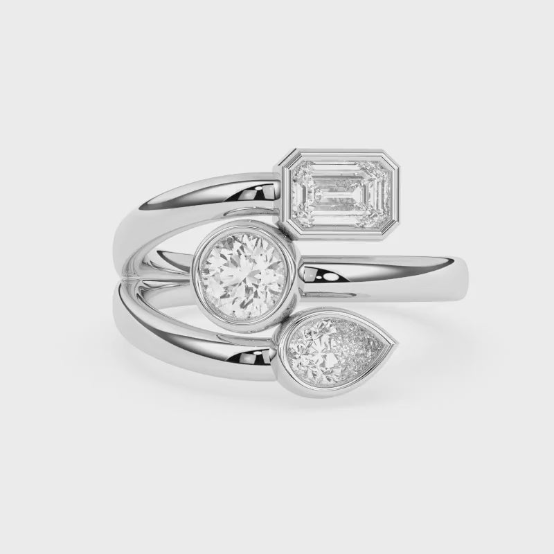 Description: Diamond Three Stone Ring, Set with One Octagon Cut Lab Diamond, One Brilliant Cut Lab Diamond & One Pear Cut Lab Diamond, Set in 9ct or 18ct White Gold or Platinum
