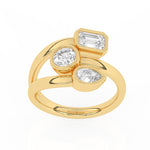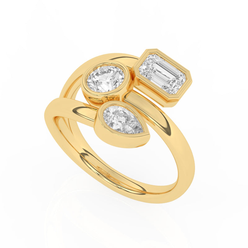 Description: Diamond Three Stone Ring, Set with One Octagon Cut Lab Diamond, One Brilliant Cut Lab Diamond & One Pear Cut Lab Diamond, Set in 9ct or 18ct Yellow Gold
