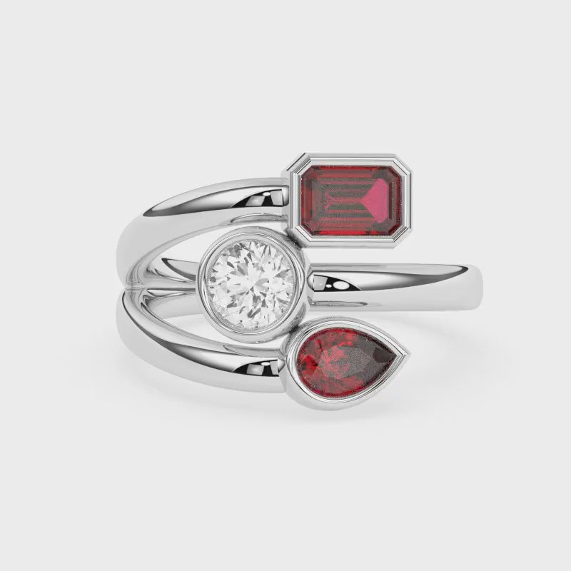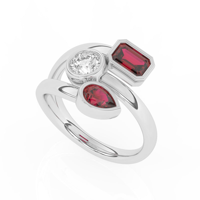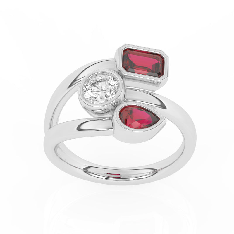 Description: Diamond Three Stone Ring, Set with One Octagon Cut Lab Ruby, One Pear Cut Lab Ruby & One Brilliant Cut Lab Diamond, Set in 9ct or 18ct White Gold or Platinum