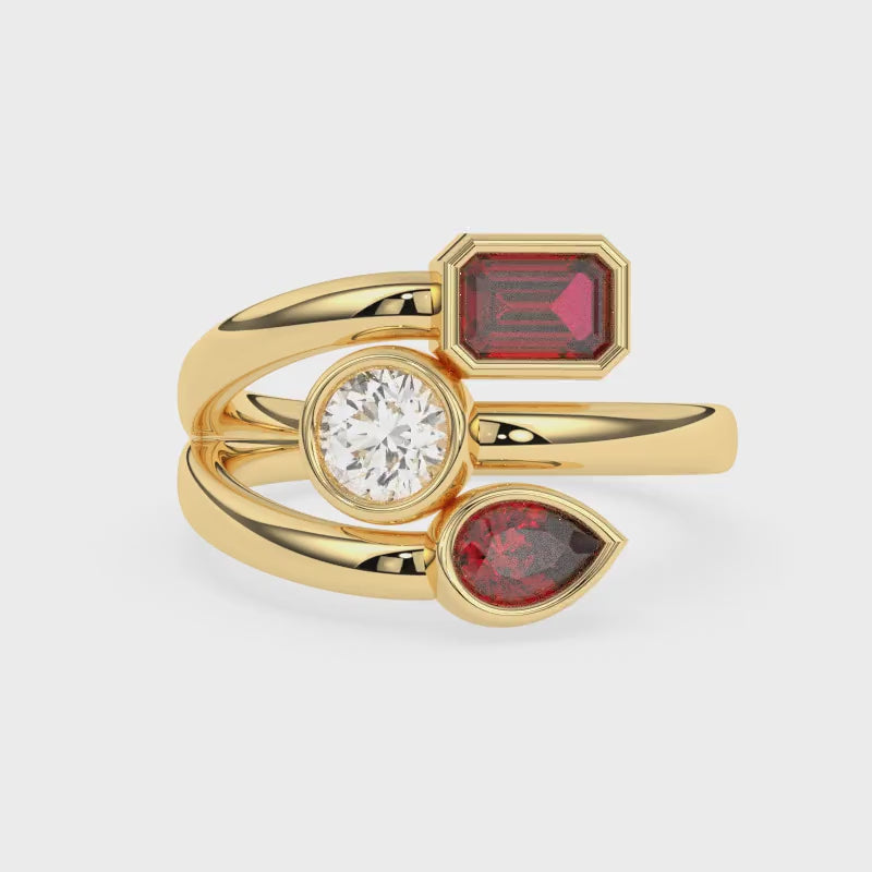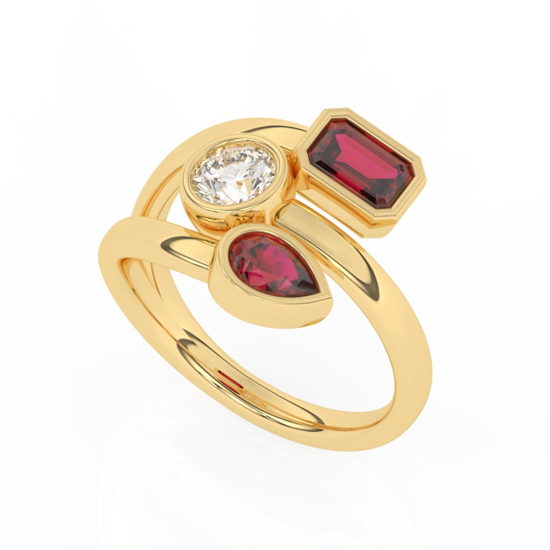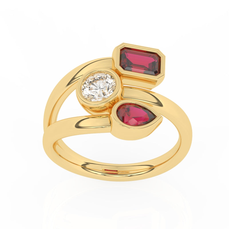 Description: Diamond Three Stone Ring, Set with One Octagon Cut Lab Ruby, One Pear Cut Lab Ruby & Brilliant Cut Lab Diamond, Set in 9ct or 18ct Yellow Gold