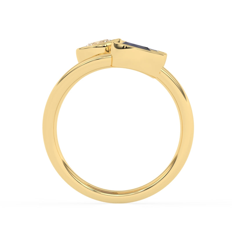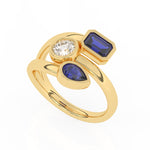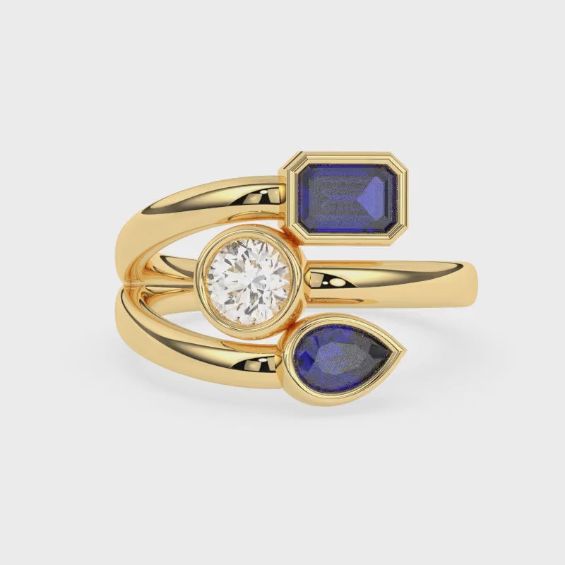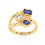 Description: Diamond Three Stone Ring, Set with One Octagon Cut Lab Sapphire, One Pear Cut Lab Sapphire & One Brilliant Cut Lab Diamond, Set in 9ct or 18ct Yellow Gold