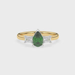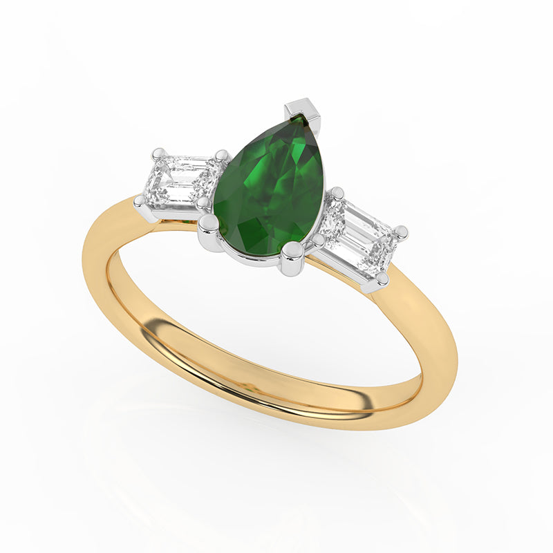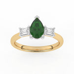 Description: Diamond Three Stone Ring, Set with Pear Cut Lab Emerald & Two Emerald Cut Lab Diamonds, Set in 9ct or 18ct Yellow Gold