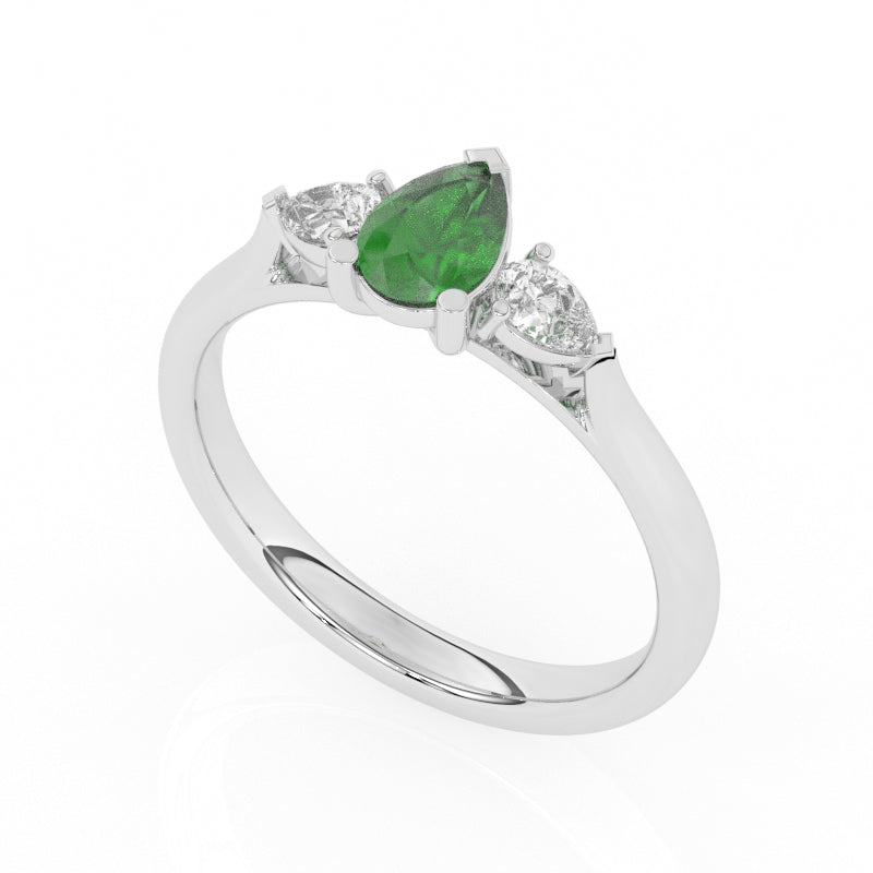 Description: Diamond Three Stone Ring, Set with Pear Cut Lab Emerald & Two Pear Cut Lab Diamonds, Set in 9ct or 18ct White Gold or Platinum