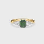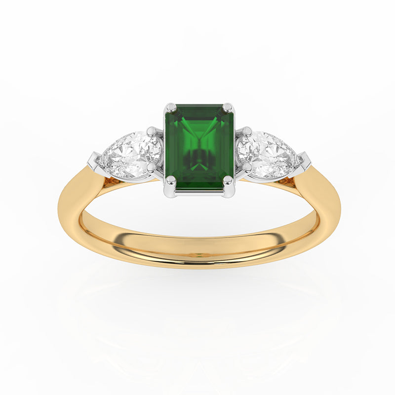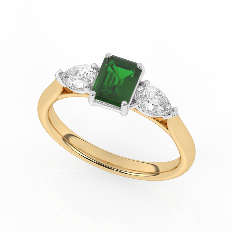 Description: Diamond Three Stone Ring, Set with Emerald Cut Lab Emerald & Two Pear Cut Lab Diamonds, Set in 9ct or 18ct Yellow Gold