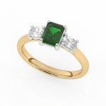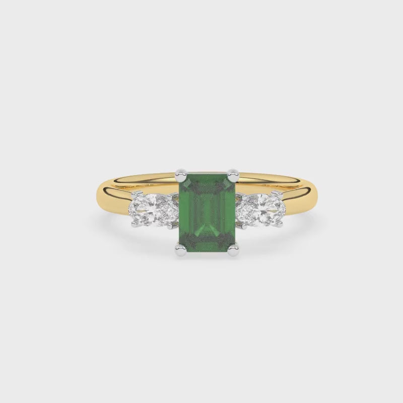 Description: Diamond Three Stone Ring, Set with Emerald Cut Lab Emerald & Two Oval Cut Lab Diamonds, Set in 9ct or 18ct Yellow Gold