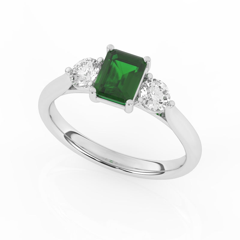 Description: Diamond Three Stone Ring, Set with Emerald Cut Lab Emerald & Two Brilliant Cut Lab Diamonds, Set in 9ct or 18ct White Gold or Platinum