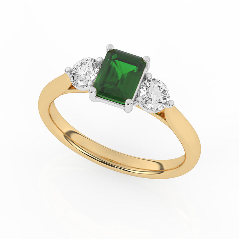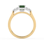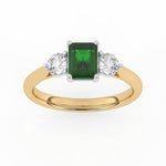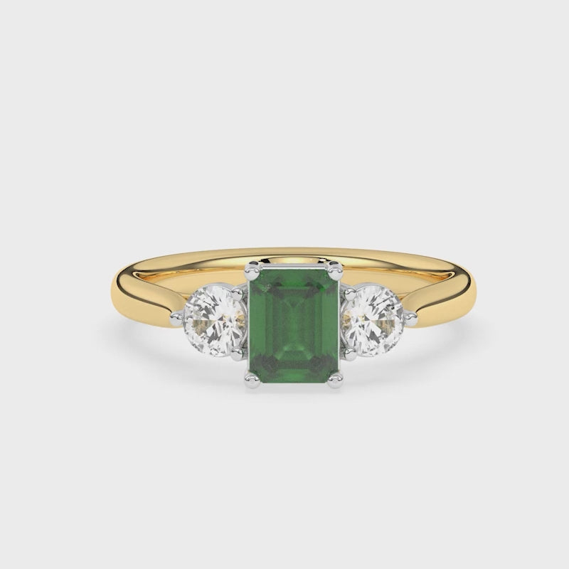 Description: Diamond Three Stone Ring, Set with Emerald Cut Lab Emerald & Two Brilliant Cut Lab Diamonds, Set in 9ct or 18ct Yellow Gold