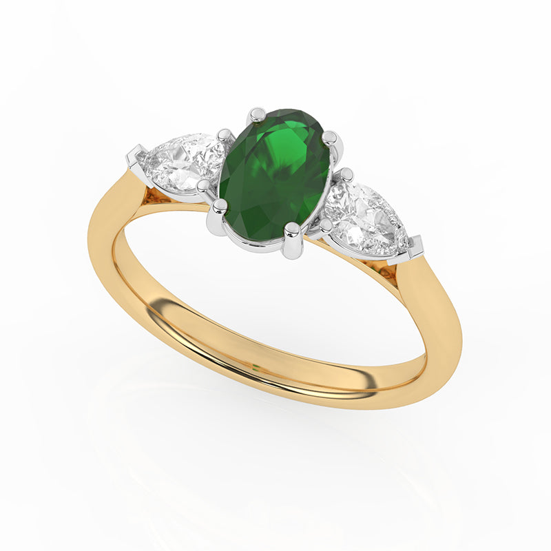Description: Diamond Three Stone Ring, Set with Oval Cut Lab Emerald & Two Pear Cut Lab Diamonds, Set in 9ct or 18ct Yellow Gold