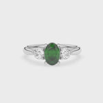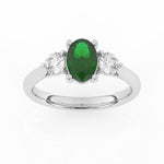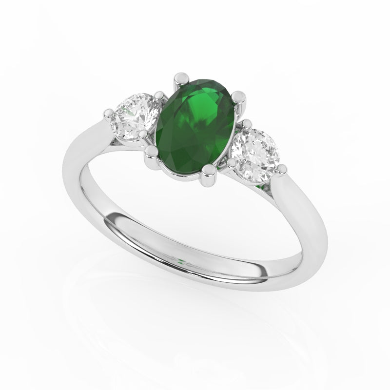 Description: Diamond Three Stone Ring, Set with Oval Cut Lab Emerald & Two Brilliant Cut Lab Diamonds, Set in 9ct or 18ct White Gold or Platinum