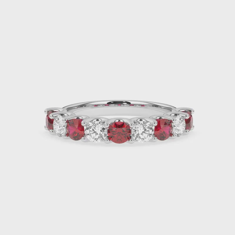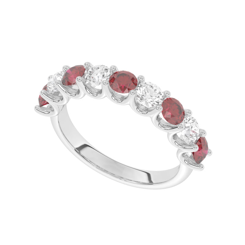 Description: Diamond & Ruby Nine Stone Ring, Set with Five Round Lab Rubies & Four Brilliant Cut Lab Diamonds, Set in 9ct or 18ct White Gold or Platinum