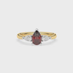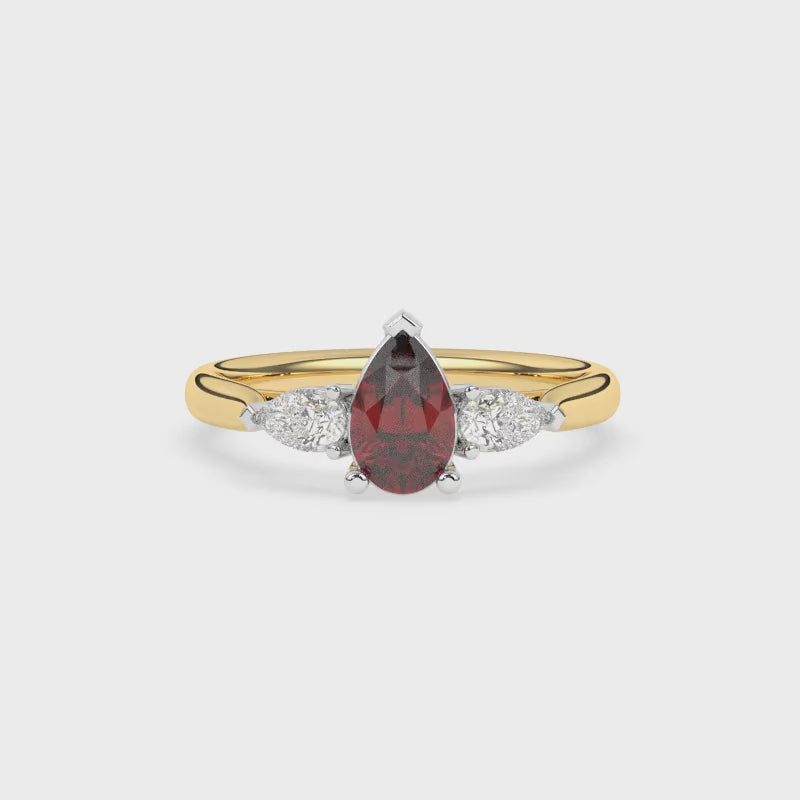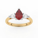 Description: Diamond Three Stone Ring, Set with Pear Cut Lab Ruby & Two Pear Cut Lab Diamonds, Set in 9ct or 18ct Yellow Gold