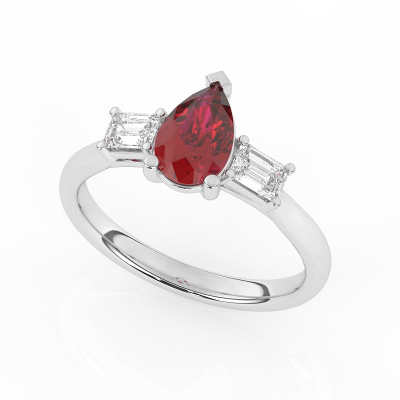 Description: Diamond Three Stone Ring, Set with Pear Cut Lab Ruby & Two Emerald Cut Lab Diamonds, Set in 9ct or 18ct White Gold or Platinum