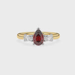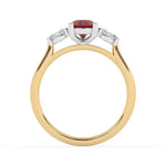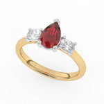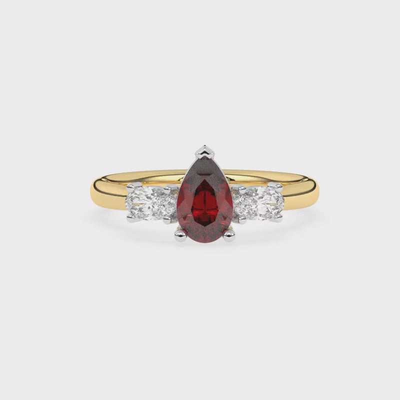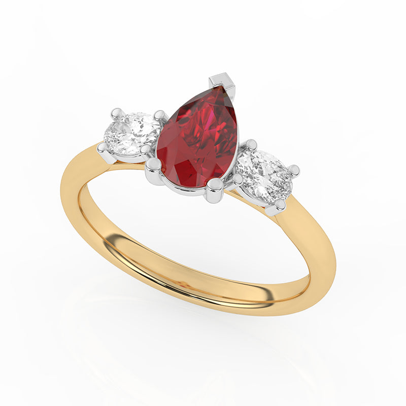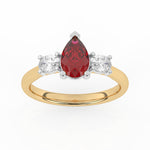 Description: Diamond Three Stone Ring, Set with Pear Cut Lab Ruby & Two Oval Cut Lab Diamonds, Set in 9ct or 18ct Yellow Gold