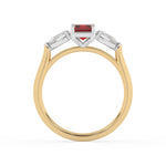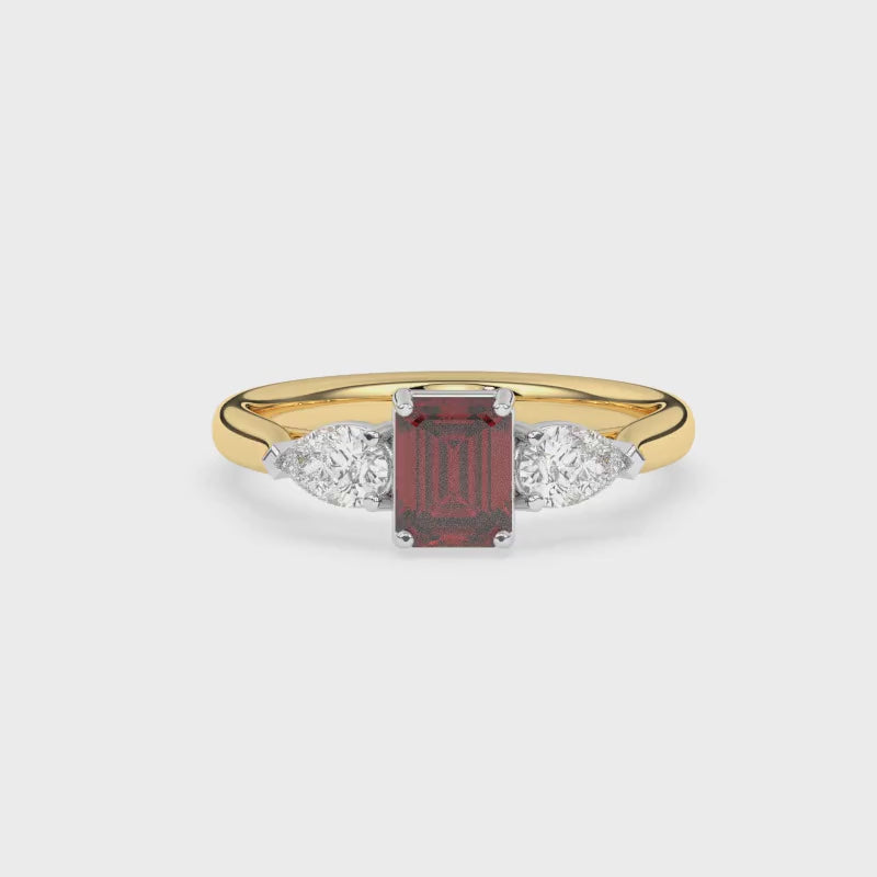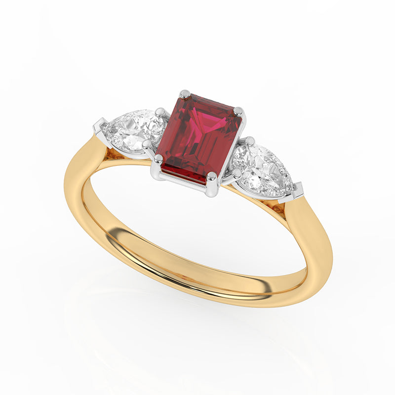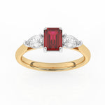 Description: Diamond Three Stone Ring, Set with Emerald Cut Lab Ruby & Two Pear Cut Lab Diamonds, Set in 9ct or 18ct Yellow Gold