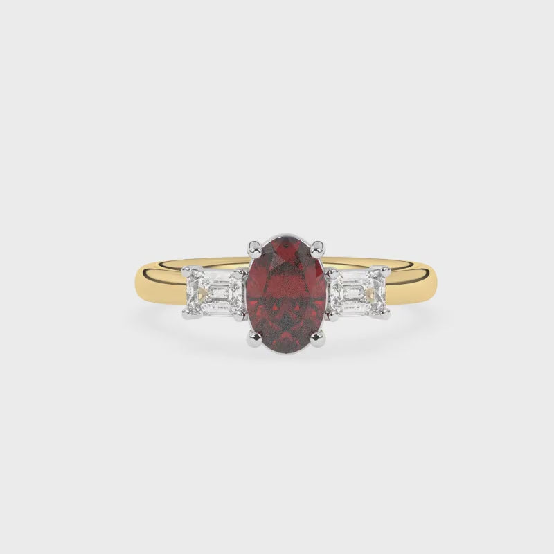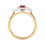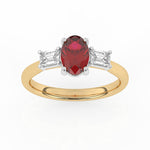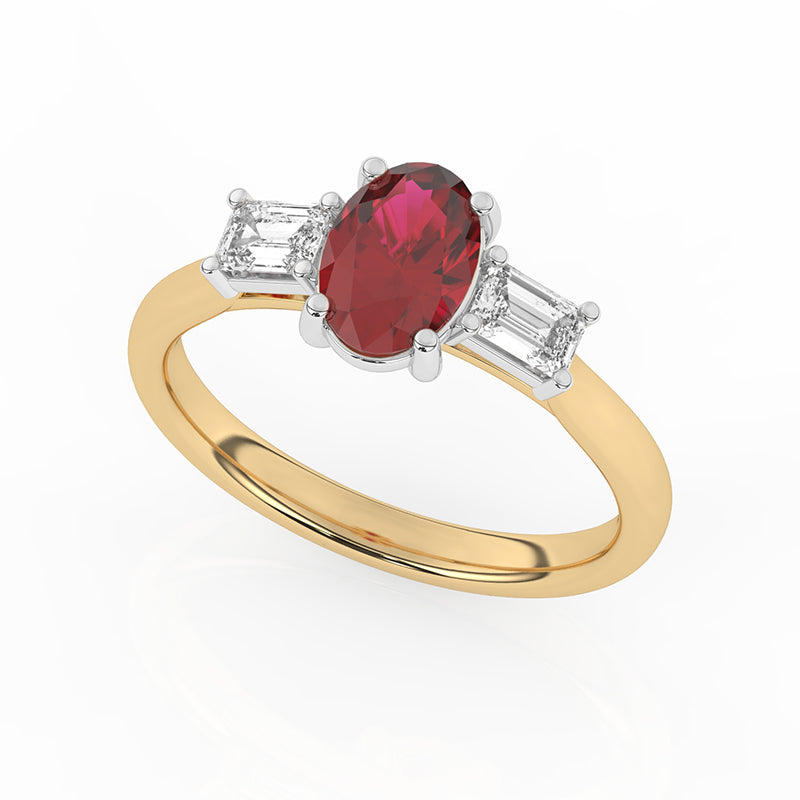 Description: Diamond Three Stone Ring, Set with Oval Cut Lab Ruby & Two Emerald Cut Lab Diamonds, Set in 9ct or 18ct Yellow Gold