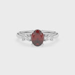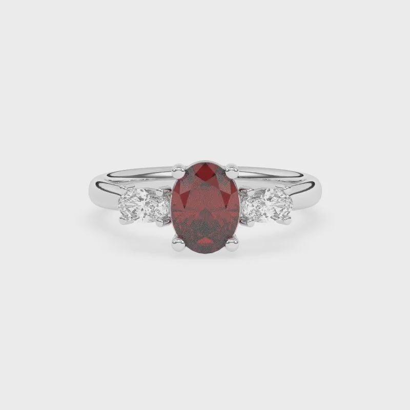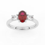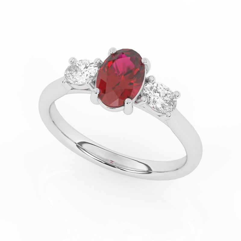 Description: Diamond Three Stone Ring, Set with Oval Cut Lab Ruby & Two Oval Cut Lab Diamonds, Set in 9ct or 18ct White Gold or Platinum
