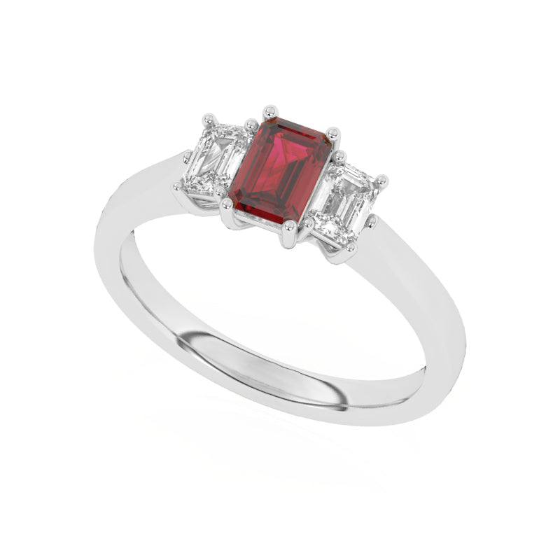 Description: Diamond & Ruby Three Stone Ring, Set with Emerald Cut Lab Ruby & Emerald Cut Lab Diamonds, Set in 9ct or 18ct White Gold or Platinum