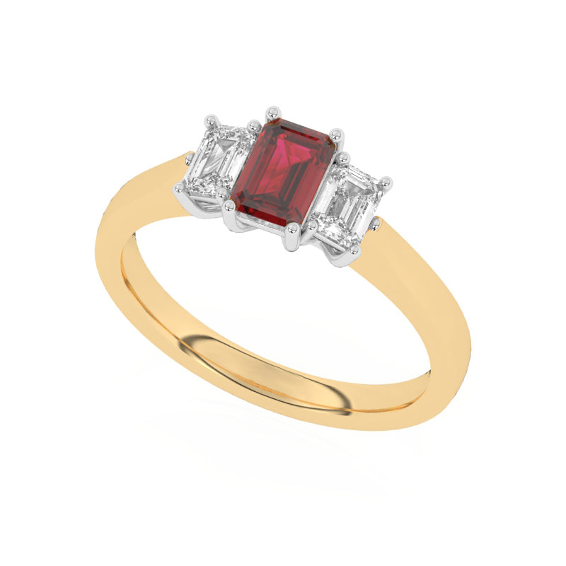 Description: Diamond & Ruby Three Stone Ring, Set with Emerald Cut Lab Ruby & Emerald Cut Lab Diamonds, Set in 9ct or 18ct Yellow Gold