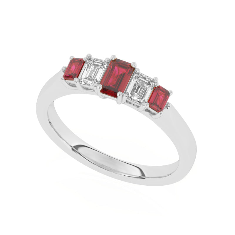 Description: Diamond & Ruby Five Stone Ring, Set with Emerald Cut Lab Rubies & Emerald Cut Lab Diamonds, Set in 9ct or 18ct White Gold or Platinum