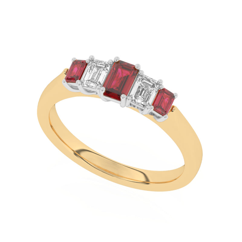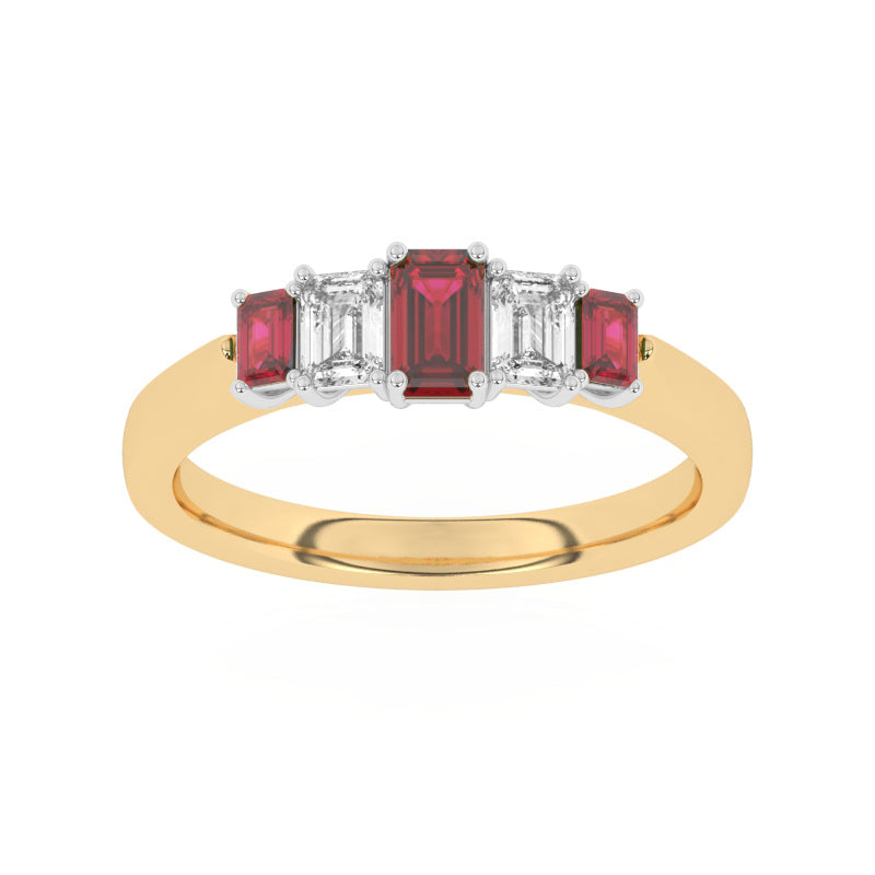 Description: Diamond & Ruby Five Stone Ring, Set with Emerald Cut Lab Rubies & Emerald Cut Lab Diamonds, Set in 9ct or 18ct Yellow Gold
