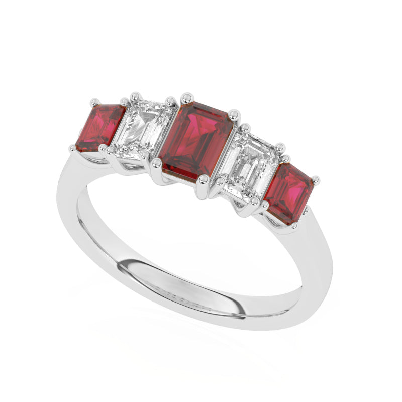 Description: Diamond & Ruby Five Stone Ring, Set with Emerald Cut Lab Rubies & Emerald Cut Lab Diamonds, Set in 9ct or 18ct White Gold or Platinum