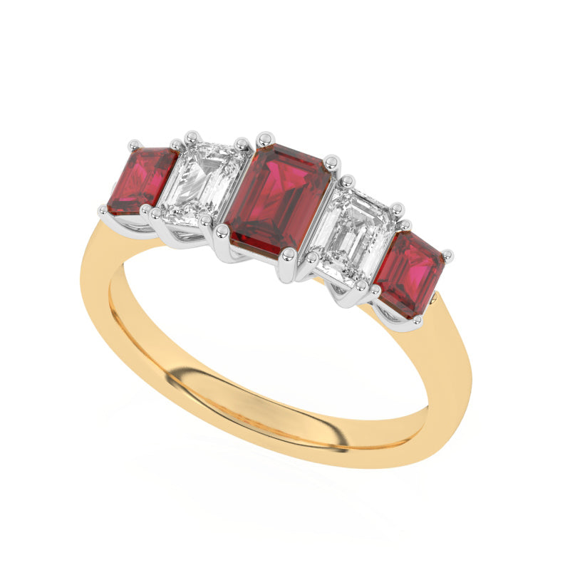 Description: Diamond & Ruby Three Stone Ring, Set with Emerald Cut Lab Ruby & Emerald Cut Lab Diamonds, Set in 9ct or 18ct Yellow Gold