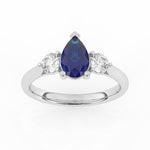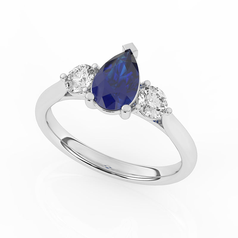 Description: Diamond Three Stone Ring, Set with Pear Cut Lab Sapphire & Two Brillant Cut Lab Diamonds, Set in 9ct or 18ct White Gold or Platinum