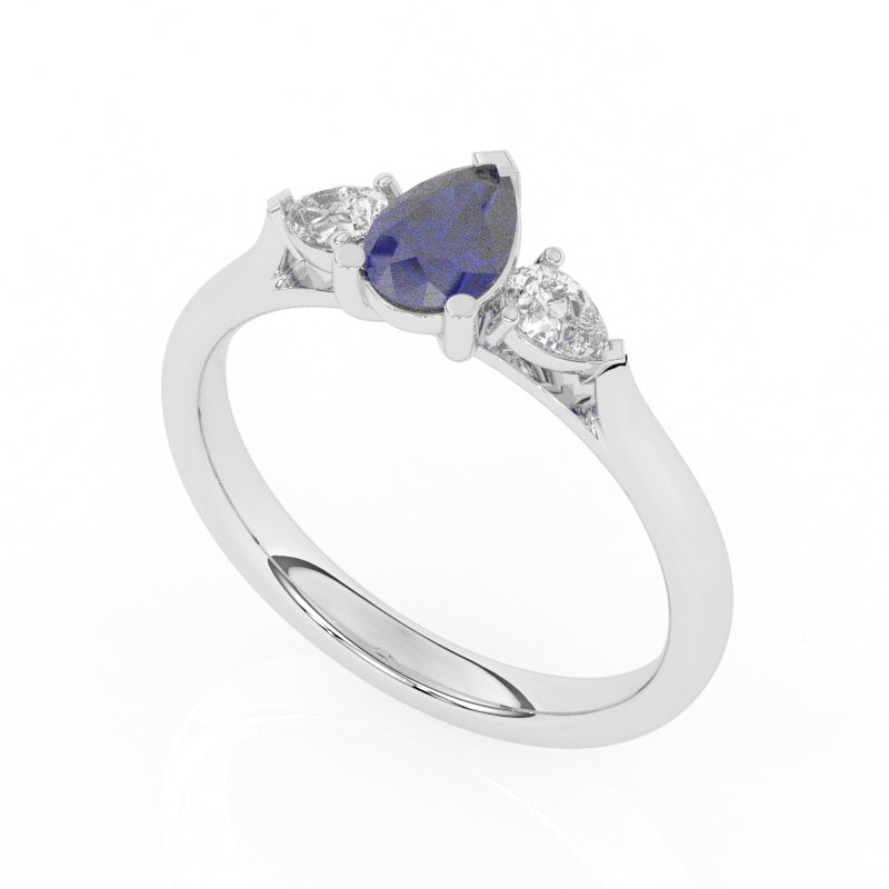 Description: Diamond Three Stone Ring, Set with Pear Cut Lab Sapphire & Two Pear Cut Lab Diamonds, Set in 9ct or 18ct White Gold or Platinum