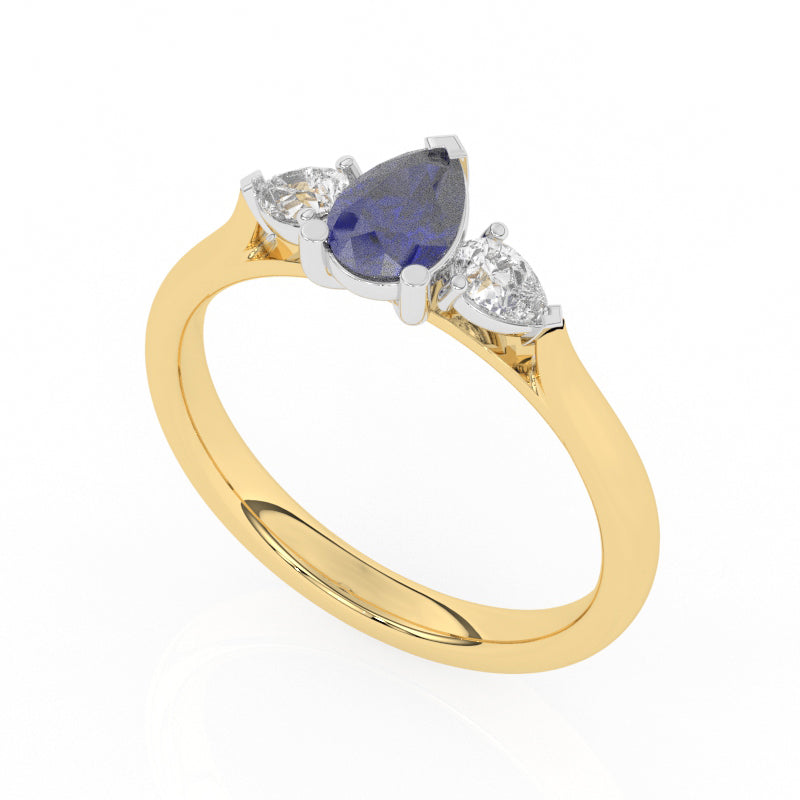 Description: Diamond Three Stone Ring, Set with Pear Cut Lab Sapphire & Two Pear Cut Lab Diamonds, Set in 9ct or 18ct Yellow Gold