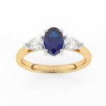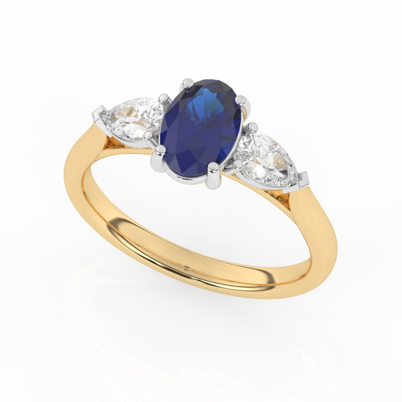 Description: Diamond Three Stone Ring, Set with Oval Cut Lab Sapphire & Two Pear Cut Lab Diamonds, Set in 9ct or 18ct Yellow Gold