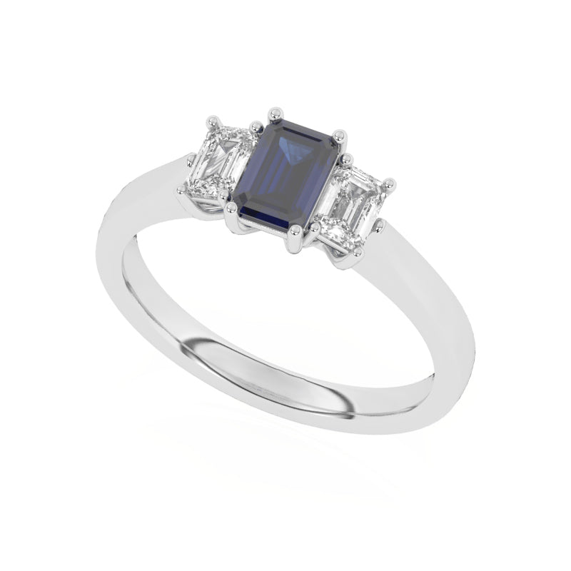 Description: Diamond & Sapphire Three Stone Ring, Set with Emerald Cut Lab Sapphire & Emerald Cut Lab Diamonds, Set in 9ct or 18ct White Gold or Platinum