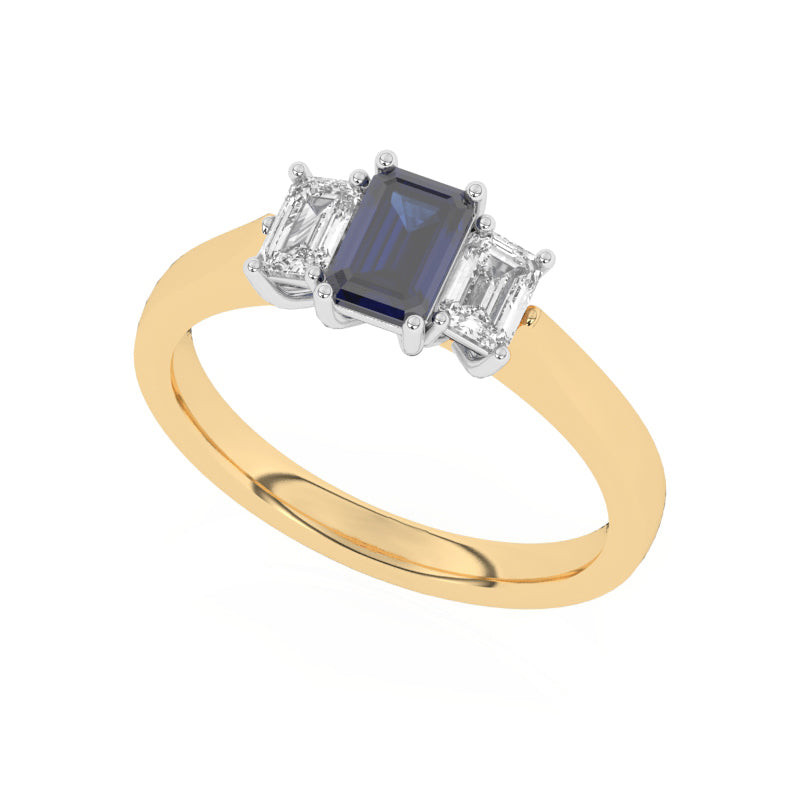 Description: Diamond & Sapphire Three Stone Ring, Set with Emerald Cut Lab Sapphire & Emerald Cut Lab Diamonds, Set in 9ct or 18ct Yellow Gold