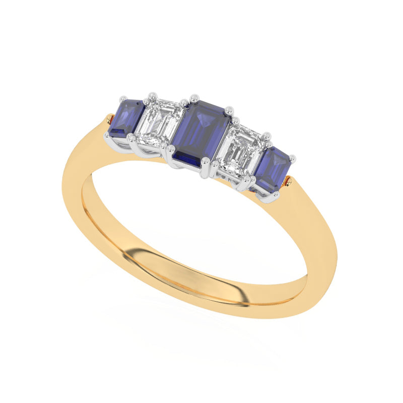Description: Diamond & Sapphire Five Stone Ring, Set with Emerald Cut Lab Sapphires & Emerald Cut Lab Diamonds, Set in 9ct or 18ct Yellow Gold