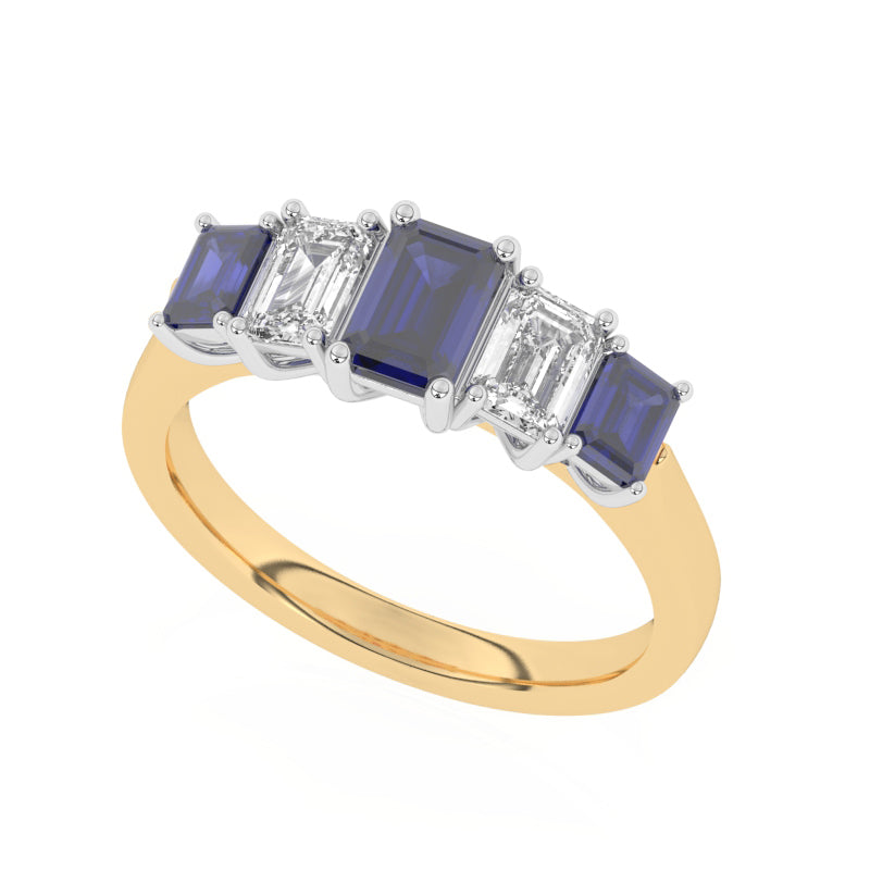 Description: Diamond & Sapphire Five Stone Ring, Set with Emerald Cut Lab Sapphires & Emerald Cut Lab Diamonds, Set in 9ct or 18ct Yellow Gold
