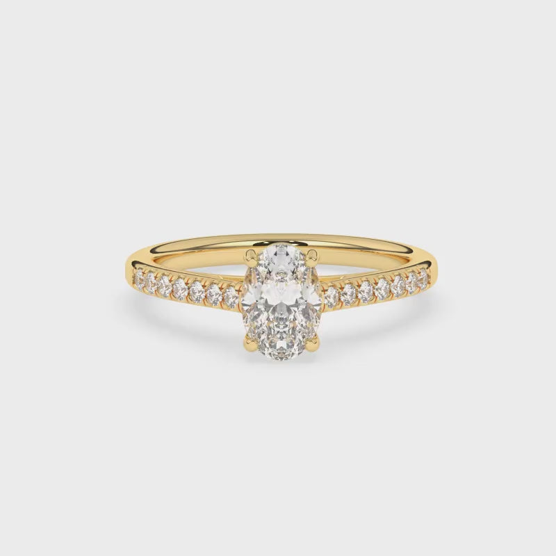Description: Diamond Solitaire Ring, Set with a 1.00ct Oval Cut Lab Diamond & Diamond Set Shoulders, Set in 9ct or 18ct Yellow Gold