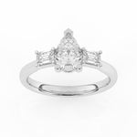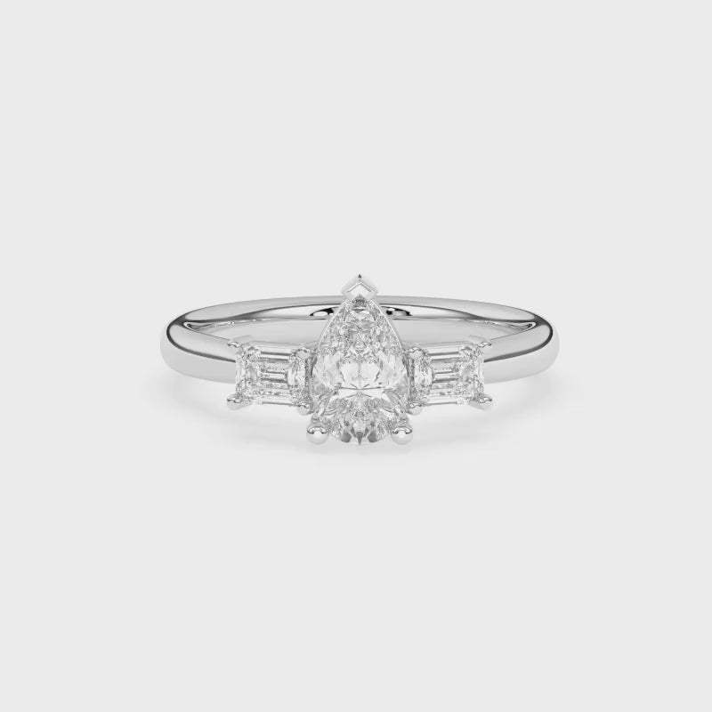 Description: Diamond Three Stone Ring, Set with Pear Cut Lab Diamond & Two Emerald Cut Lab Diamonds, Set in 9ct or 18ct White Gold or Platinum
