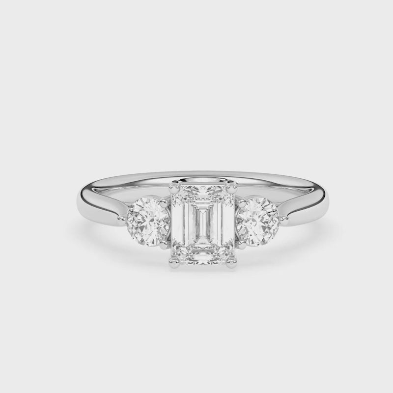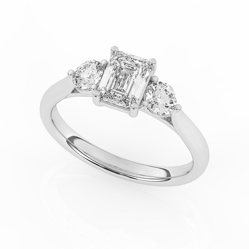 Description: Diamond Three Stone Ring, Set with Emerald Cut Lab Diamond & Two Brilliant Cut Lab Diamonds, Set in 9ct or 18ct White Gold or Platinum
